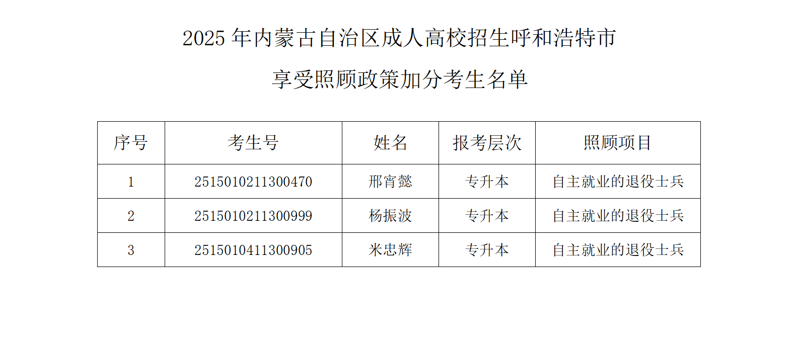/ 2025年内蒙古自治区成人高校招生呼和浩特市享受照顾政策加分考生名单