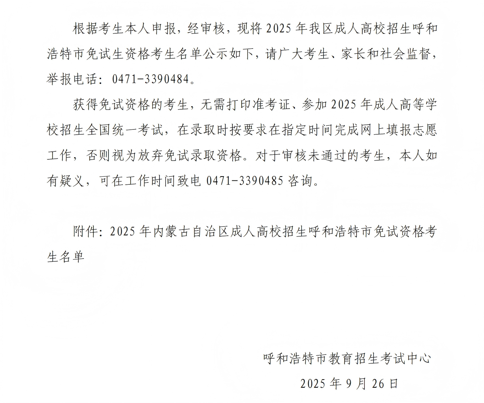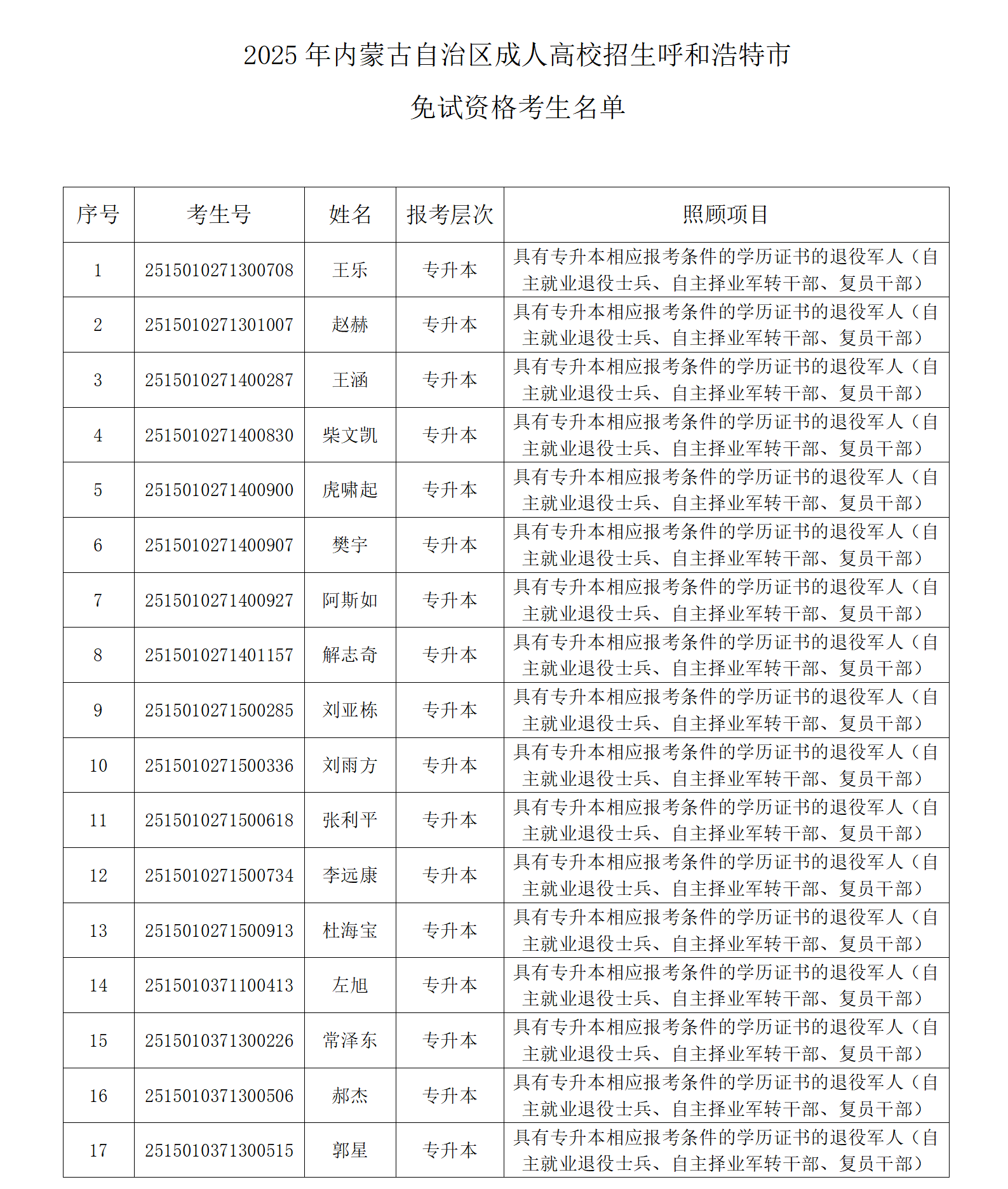 / 2025年内蒙古自治区成人高校招生呼和浩特市免试生资格考生名单