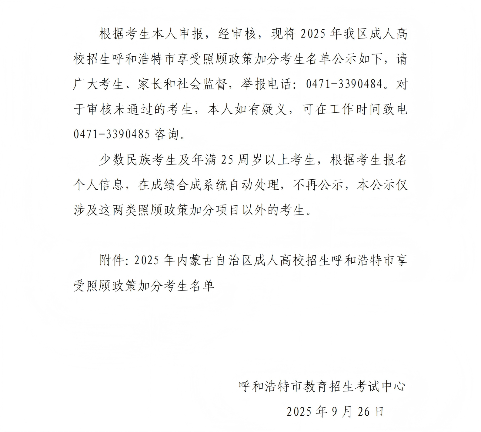 / 2025年内蒙古自治区成人高校招生呼和浩特市享受照顾政策加分考生名单